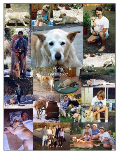 Abby was born in May 1991 in Vista, one of ten pups born to a black Labrador retriever and German shepherd couple. She may have been a mutt, but she came from good stock. She spent the first years of her life in San Marcos but had the good fortune to be adopted by her mom Jerre and move to Encinitas. Encinitas was her paradise ? a large yard with room to explore, daily walks to the ocean overlook (and occasionally on the beach!), and running and sniffing with her friends at the D Street dog park. Abby had many dog-friends over the years: Canella, Amber, Roamer, Milo, Hooper, Hobbs, and Ruger. She learned to love her two people cousins, Alek and Max. Abby was a sweet dog, well-behaved, friendly with other dogs, and loved everyone ? particularly her Grammy who brought her cookies every visit. She was even good to (or at least tolerated!) her two cat-sisters.